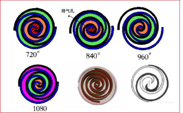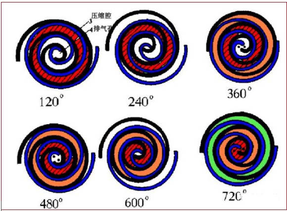 在壓縮過程中,渦旋定子(靜盤)保持固定,而渦旋轉(zhuǎn)子(動(dòng)盤)則每隔90°順時(shí)針圓周運(yùn)動(dòng),氣腔內(nèi)的氣體即被壓縮成高壓氣體,并經(jīng)渦旋中間的排氣口排出。