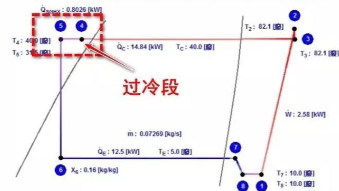 過冷是為了使節流前的制冷劑液體減少在節流過程中產生的閃發氣體,減少閃發氣體所占容積的比容,提高單位制冷量;同時也提高了回氣的過熱度,對保護壓縮機不處濕沖程運轉,都有一定的好處。過冷度在壓焓圖的表示: